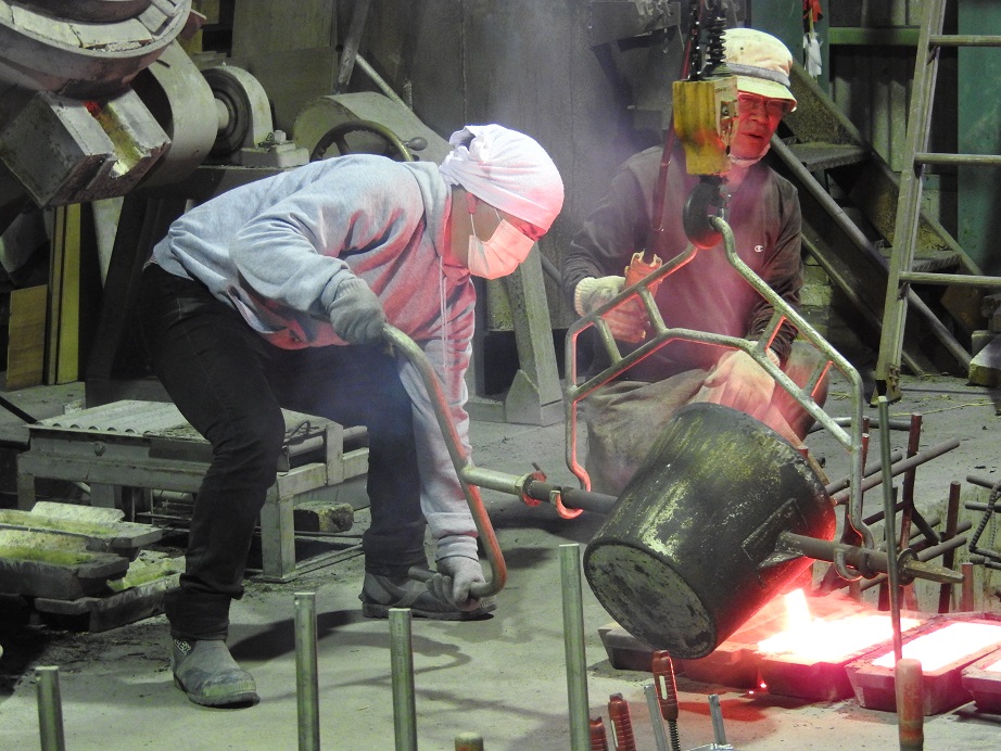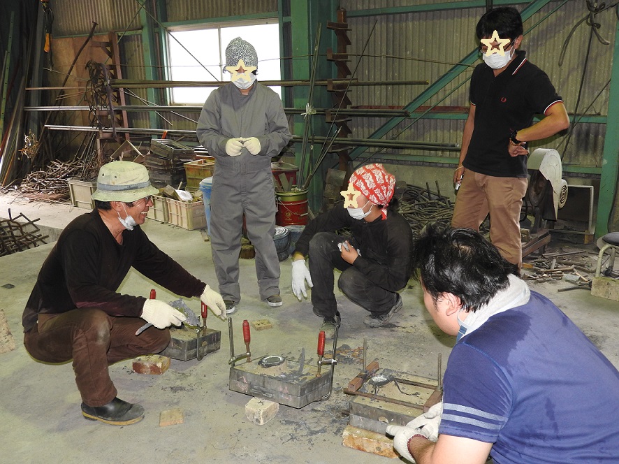 田中の指導を受けながら、自分の作品を鋳造しています。